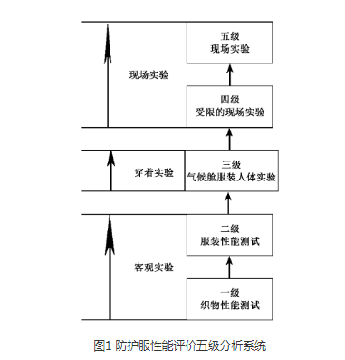 防化服的性能評價(jià)主要包含防護性能以及舒適性2個(gè)方面。目前成熟的評價(jià)體系是五級分析系統,如圖1所示??梢詣澐譃榭陀^(guān)評價(jià)、人體穿著(zhù)實(shí)驗以及現場(chǎng)實(shí)驗3個(gè)層次。