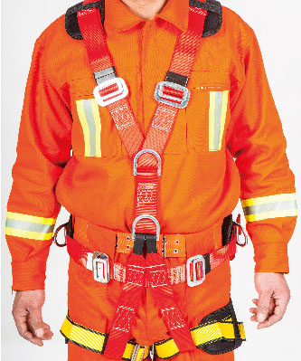 ·設(shè)計負荷為2.6KN,固定于腰部、大腿或臀部以下部位,適用于對他人進行救援。II型消防安全帶由織帶、腰帶帶扣和腿帶帶扣和拉環(huán)等零部件構(gòu)成,為坐式安全吊帶。