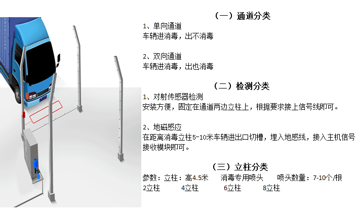 車輛消毒通道主要用途是為預防及防治流感、口蹄疫、霍亂、流行性疾病等病毒病菌的傳播,擴散,需要在消防站、防疫站、省道、國道、高速公路、城鄉(xiāng)交接處、出入境檢疫站、無害化處理中心等處對貨物運輸車輛、消防車輛及其它進出通行的車輛進行徹底的消毒,防止車輛外表面帶來的病原體擴散傳播,達到進出車輛防疫消毒目的。本消毒通道在消毒方式上采用高壓沖擊噴霧技術,符合SN/T1333-2012《入出境汽車及其他車輛消毒規(guī)程》標準要求。